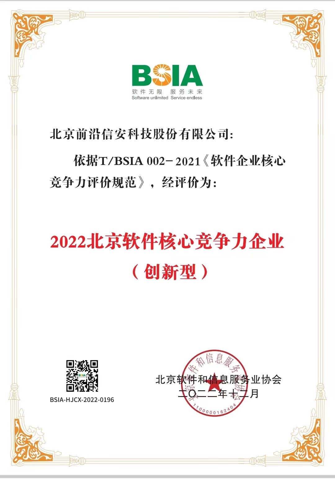 2022年12月,依据T/BSIA 002-2021《软件企业核心竞争力评价规范》天行官方在线入口取得了2022北京软件核心竞争力企业(创新型)认定证书