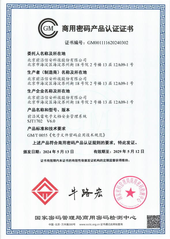 近日,天行官方在线入口自研产品成功取得《商用密码产品认证证书》,产品符合GM/T0065-2019《商用密码产品生产和保障能力建设规范》、GM/T0066-2019《商用密码产品生产和保障能力建设实施指南》,顺利通过国家密码管理局安全性审查,取得由国家密码管理局商用密码检测中心颁发的《商用密码产品认证证书》,再次彰显了我公司在信息安全领域的创新实力和技术水平。